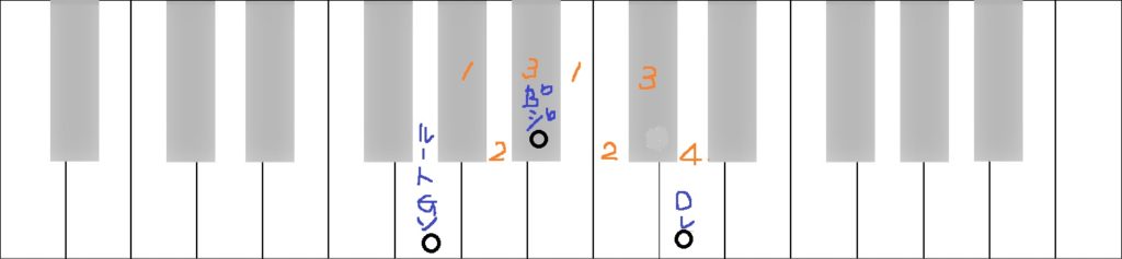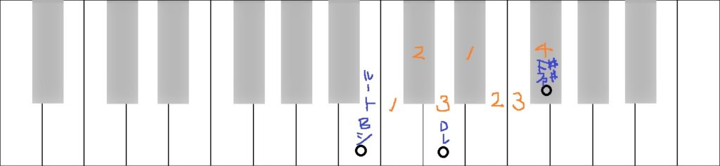 Bマイナーはルート音がB(シ)で3つ目がD(レ)で そこから4つ目がF♯(ファ♯)を押さえると