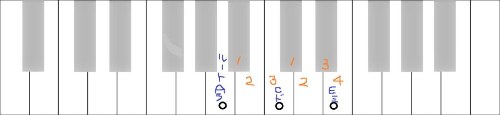 例えばCマイナーの場合、ルート音がC(ド)で次の音は3つ目のE♭(ミ♭)で
