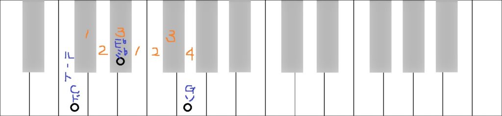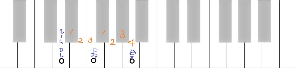 Fマイナーは ルート音がF(ファ)で3つ目はA♭(ラ♭)で、そこから4つ目はC(ド)で押さえると
