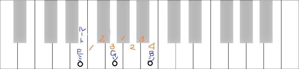 Eマイナーだとルート音がE(ミ)でそこから3つ目はG(ソ)、そしてそこから4つ目はB(シ)