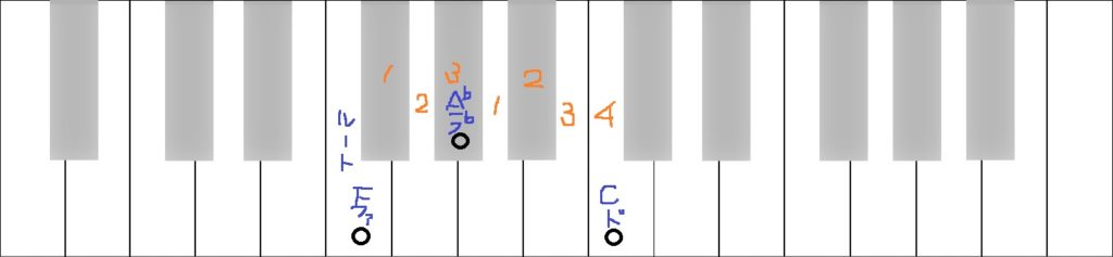 その次の音はそこから4つ目G(ソ)を押さえると Cマイナー ド ミ♭ ソ の出来上がり!